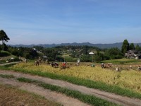 この写真は、昨年の鴨川自然王国での収獲風景です。私たちが田植えをする大山千枚田はこの場所より少し下方にある棚田。