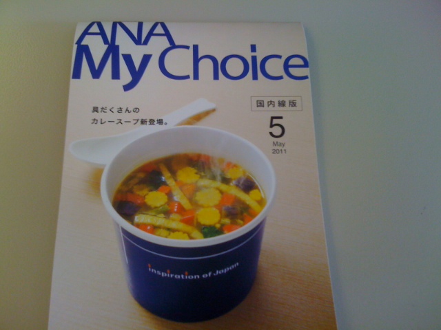 写真は、ANAさん国内線のMyChoiceメニュー、ANAさんって国内線 のコーーヒーも有料(300円)なのですね、写真のカレースープは500円、オーダーしていませんので、お味のほどはあかりません。帰路に使ったJALさんは、無料のままでした、CAさんも一生懸命でした、「がんばれJAL!」かな。。