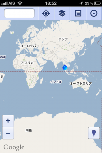 興味のある場所をタッチすると地図画面に切り替わり地図上にマークが表示されます。画面上部のアイコンは、左から現在位置の表示、レイヤーの切り替え(衛星写真などに切り替えられます)、リズト表示、ログインなどその他の機能です。経路検索機能なども付いています。現在位置はGPSで自動的に移動しますので、簡易カーナビとして十分使えると思います、ただ現在はデータ通信ができる環境でなければ地図が表示されませんので、ソフトバンクなら「海外パケットし放題」などを利用することになると思います、オフラインで動くようになるともっとうれしいのですが、1980円/日でカーナビと思えば、価値は十分あるように思いますよ。iphone使いの我が家としてはちょっとくやしいのですが、Andoroidの最新OSなら、これがオフライン(通信費用無料)で使えるらしいです、どなたか試していただくとうれしいです。