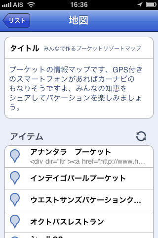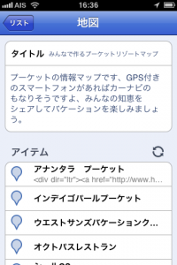 「みんなで作るプーケットリゾートマップ」 のタイトルが表示されたら「完了」をタッチです。リスト画面にもどって表示された「みんなで作るプーケットリゾートマップ」 をタッチします。「みんなで作るプーケットリゾートマップ」のタイトルと説明が表示されますので、下のほうにある「アイテム」の横の丸い矢印をタッチしてください。登録したホテルなどの情報が表示されます。