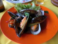 日差しの強い午後2時過ぎに出かけて行ってのランチだったので、ランチタイムのピークを過ぎたところ。広い店内の「どこの席でもどうぞ~」とフレンドリー。中には首からお勧めメニューを背中にしょってる長袖長ズボン靴下にサンダル履きという南国とは思えない物を身にまとい元気に働いてるおばちゃんもいました。このおばちゃん!食事が終わった私たちに「写真を撮りなさいよ!!」とはっぱに乗っかった大きな青虫?毛虫?を見せに来た!!私は大丈夫だけど、苦手な人は引いてしまうよね。