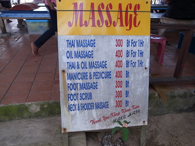 私は1時間のタイマッサージを 、夫はフットマッサージ+フットスクラブでかかとのお手入れを。それぞれ、お値段は300バーツづつ、陽気な豪快なおばちゃまたち、マイカオのマリオットのおば様たちより上手ですよ。お試しあれ!