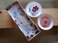 いつもなら使うときに花びらが邪魔になるだろう・・・と思うので、溶けない物は何も入れないのが私の石鹸でした 。でもちょっと真っ白い石鹸の中に花びらが入ったらきれいかな!なんて思ったので、4gほど入れてみました。