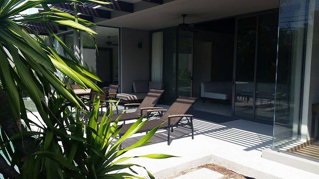 アナンタラのホテルヴィラと同じような作りの大きな門を入ると、プールとテラスがみえて、写真のデッキチェアの後ろ、ガラス扉から入ります。