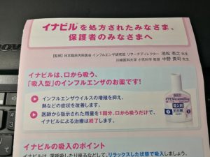 「イナビル」という、口から吸う「吸入型」のインフルエンザのお薬が処方されました。