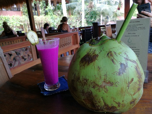 サンドイッチとスムージーとyoungココナッツのジュース。