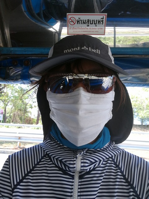 排気ガスの臭いと埃と差し込む日差しに困り始めて、マスクとラッシュガードを着用する。