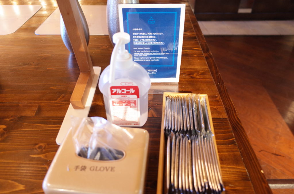 使い捨てのグローブ、おしぼりなど清潔を保つためのグッズはいろいろと置いてありました。