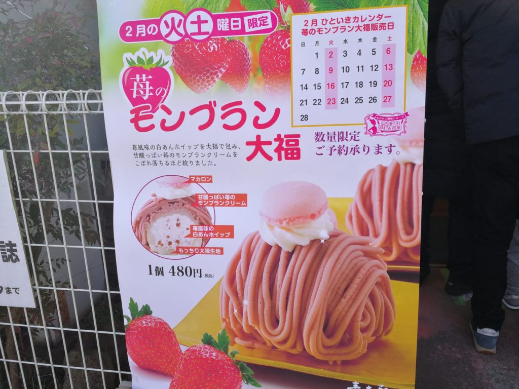 この日はイチゴのモンブラン大福・・・(こちらは正規品!)これが工場の売店でも買える特別な日でした。