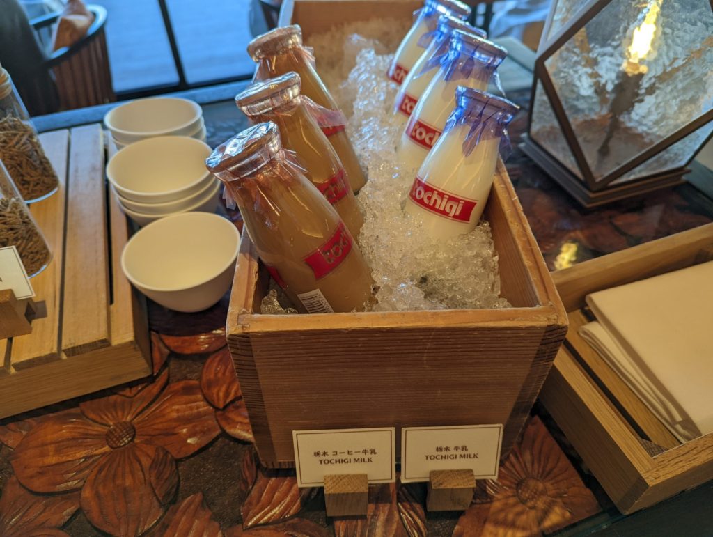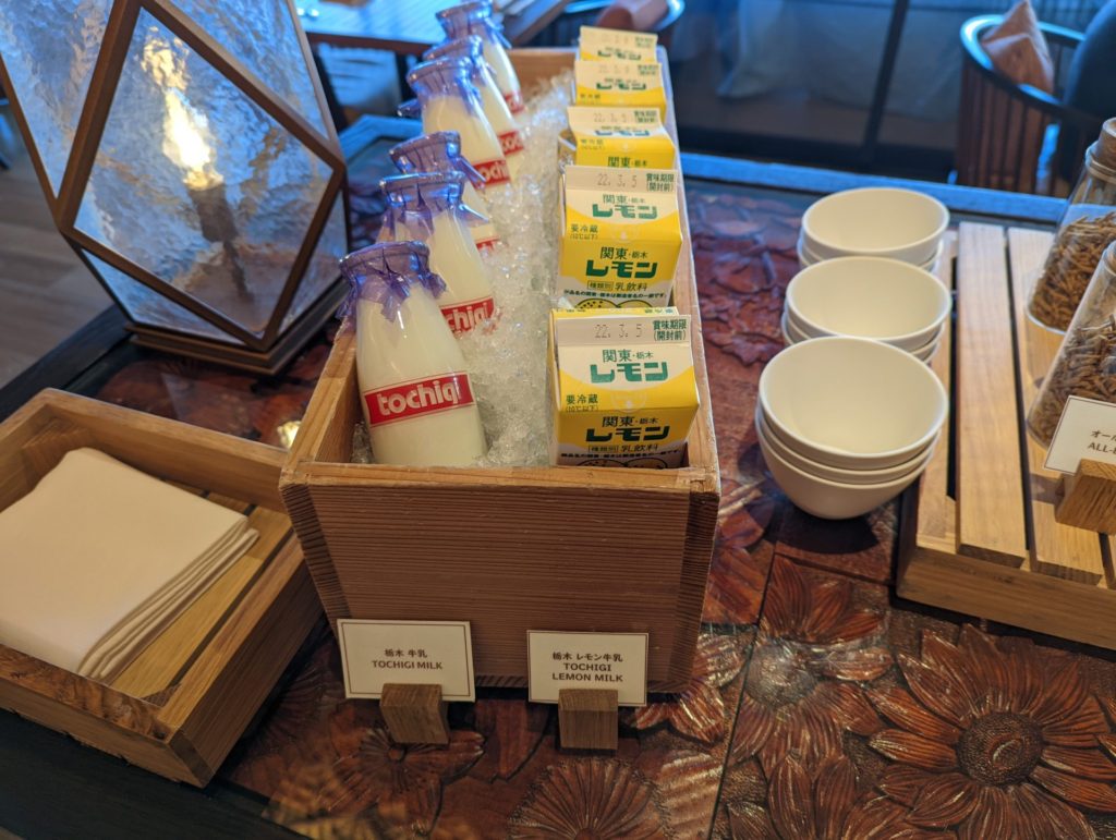 レストラン中央のテーブルに栃木の牛乳、パックのジュースヨーグルト、シリアルなどが置いてあります。自由に食べられます。