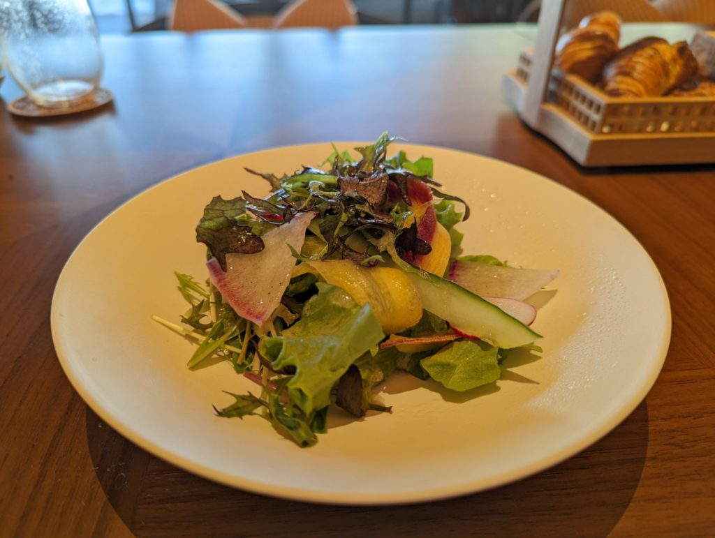 いつものように飲み物をお願いして、今日のサラダとパンが運ばれてきます。