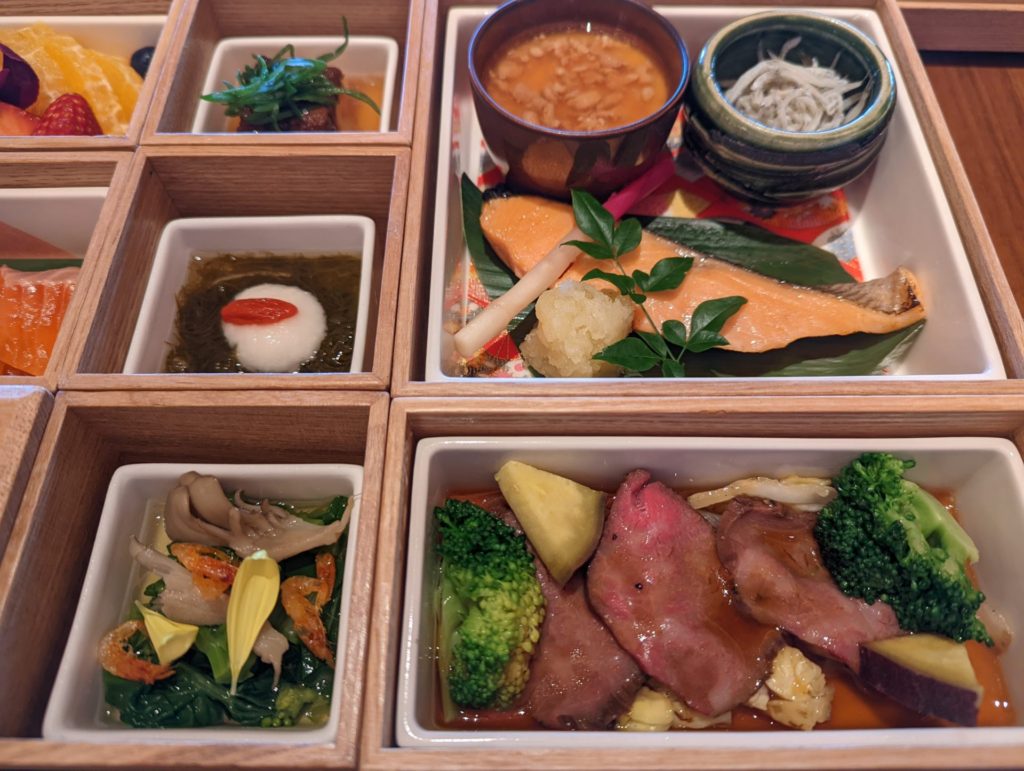 定番は、ローストビーフ・季節のお造り(和食)・スモークサーモン(洋食)かな。